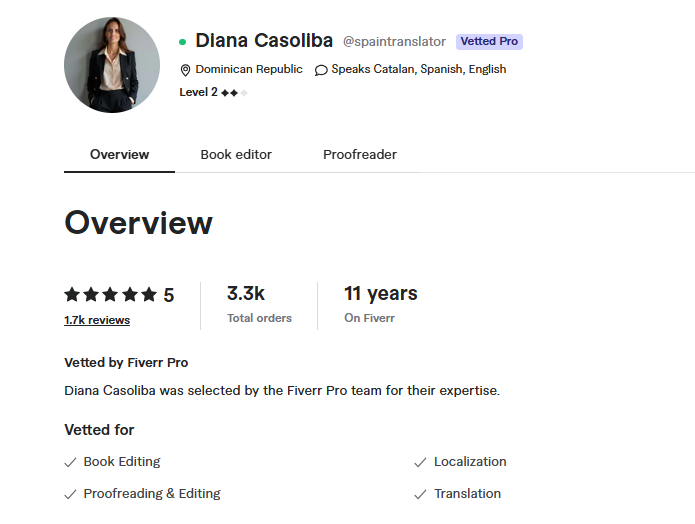 I have been vetted by Fiverr Pro in four distinct categories: Translation, Localization, Proofreading, and Book Editing. This recognition reflects the quality of my work and my commitment to maintaining the highest professional standards across every project.