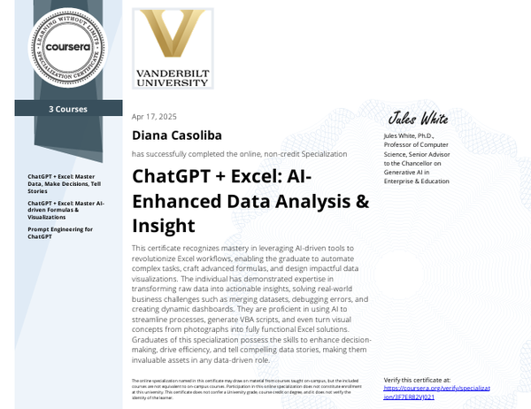 Coursera • August 17th, 2025 Vanderbilt University ChatGPT + Excel: AIEnhanced Data Analysis & Insight
